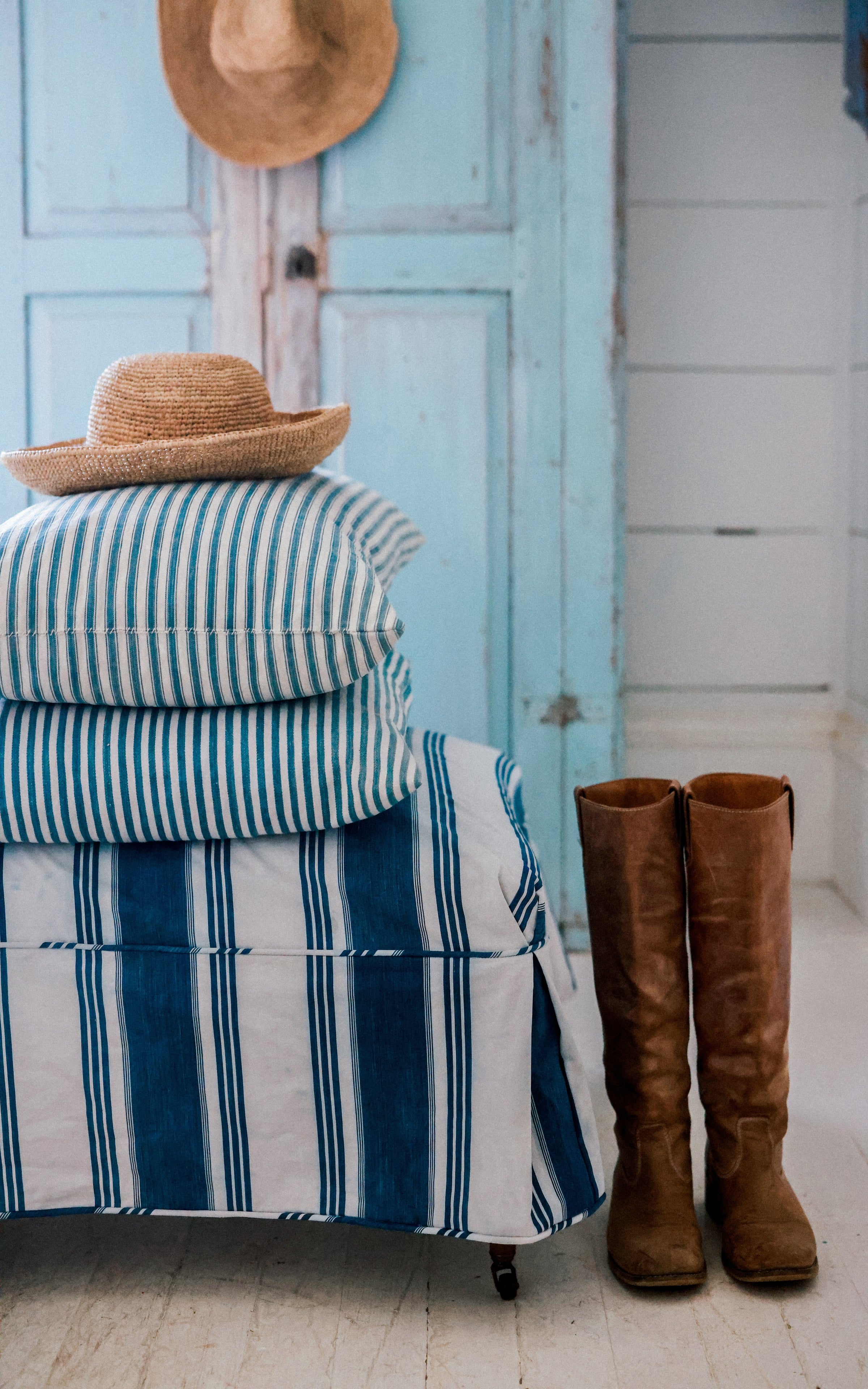 This is a vintage French ottoman. It is vintage and shows signs of wear. I had the ottoman upholstered in vintage French ticking and also had a slipcover made for it. Please note the ticking is vintage and shows discolorations and the indigo dye has bled into the white stripes in some areas. We love the beautiful patina and think it adds charm to this beautiful ottoman. The ticking and ottoman was found in Paris.