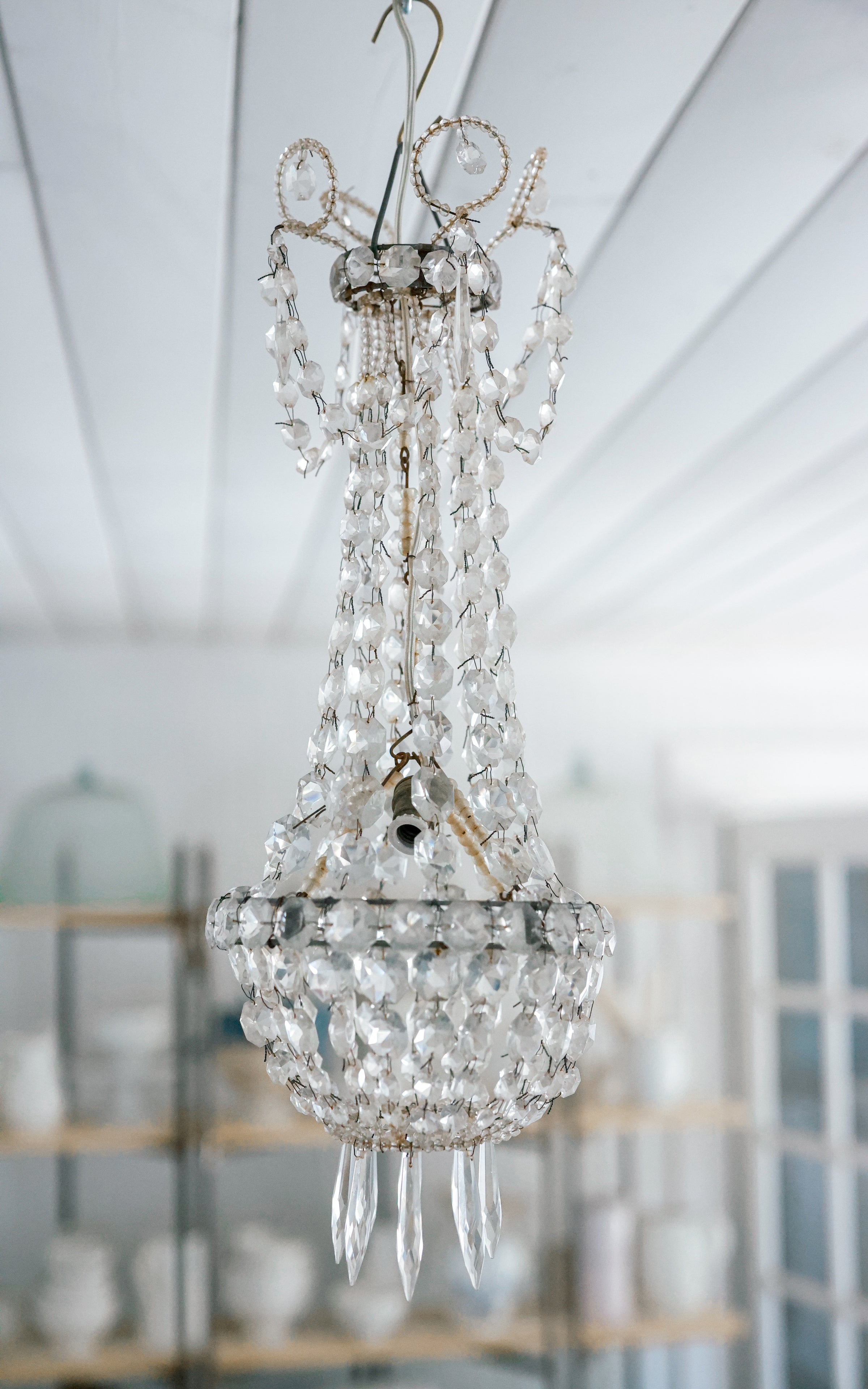 This is a petite vintage French chandelier. It is vintage and shows signs of wear. It may contain discolorations. Please note the chandelier is vintage and is not in perfect condition. I found it at a market in Pairs. There is only one light socket that hangs down through the center of the chandelier. Please see the 7th image. The chandelier is sold as is condition. It has not been rewired. It is up to the buyer to have wiring checked. The metal contains rust and some of the crystal contain staining. Please note during transportation some of the crystals may become disconnected and will need to be reattached.