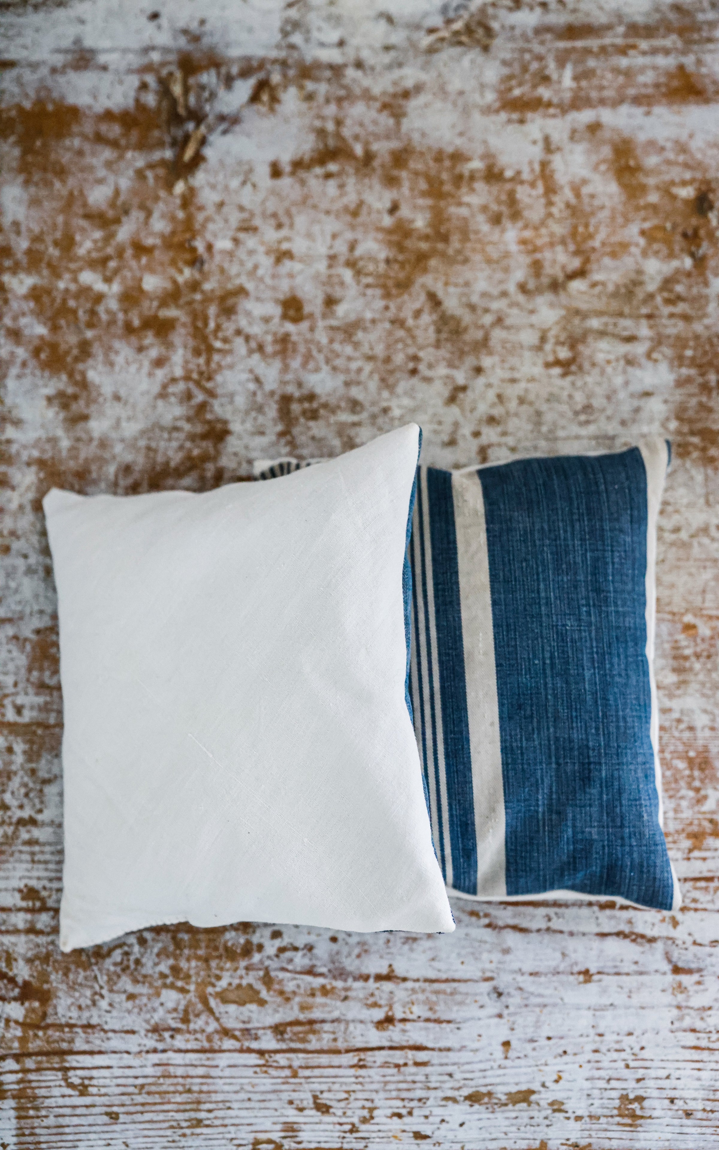 The textiles are vintage and show signs of wear and may contain discolorations.  The back is made of vintage French linen.  The pillows measure 7 1/2" x 7 1/2" and are filled with 6 to 8 ounces.