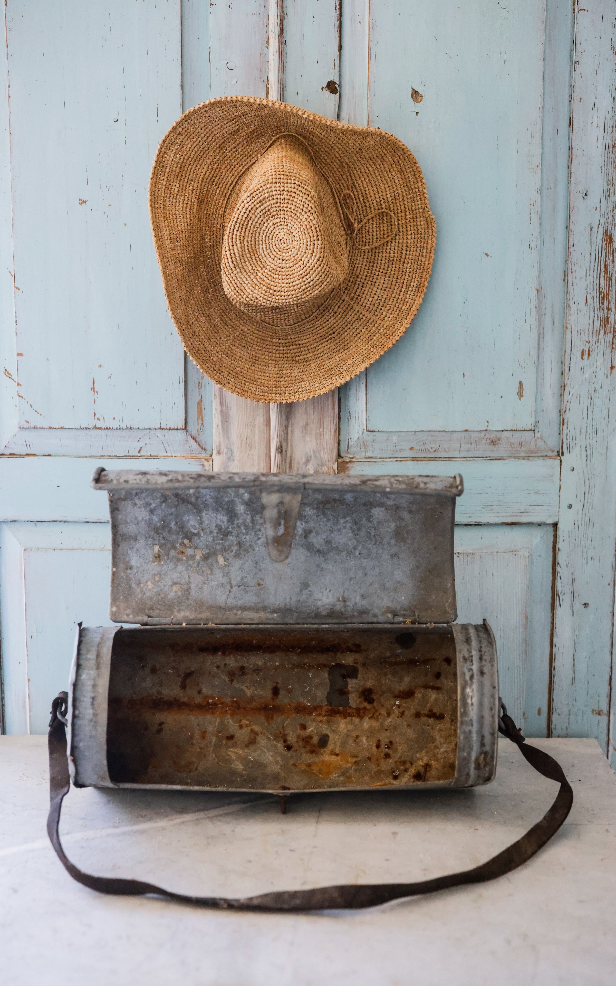 This is a vintage French zinc container. It is vintage and shows signs of wear and contains rust. The metal is worn in areas and may contain holes and indentations.