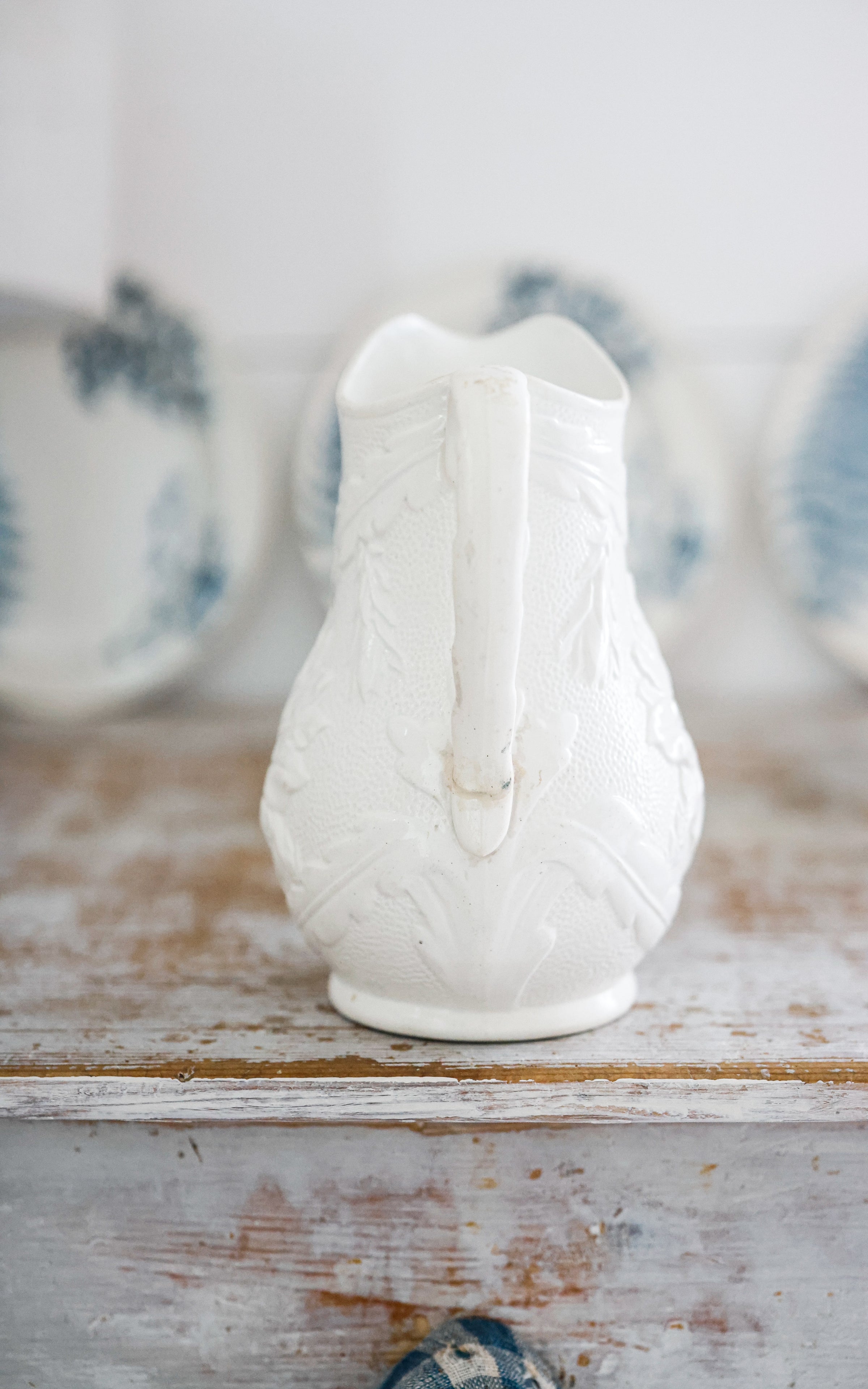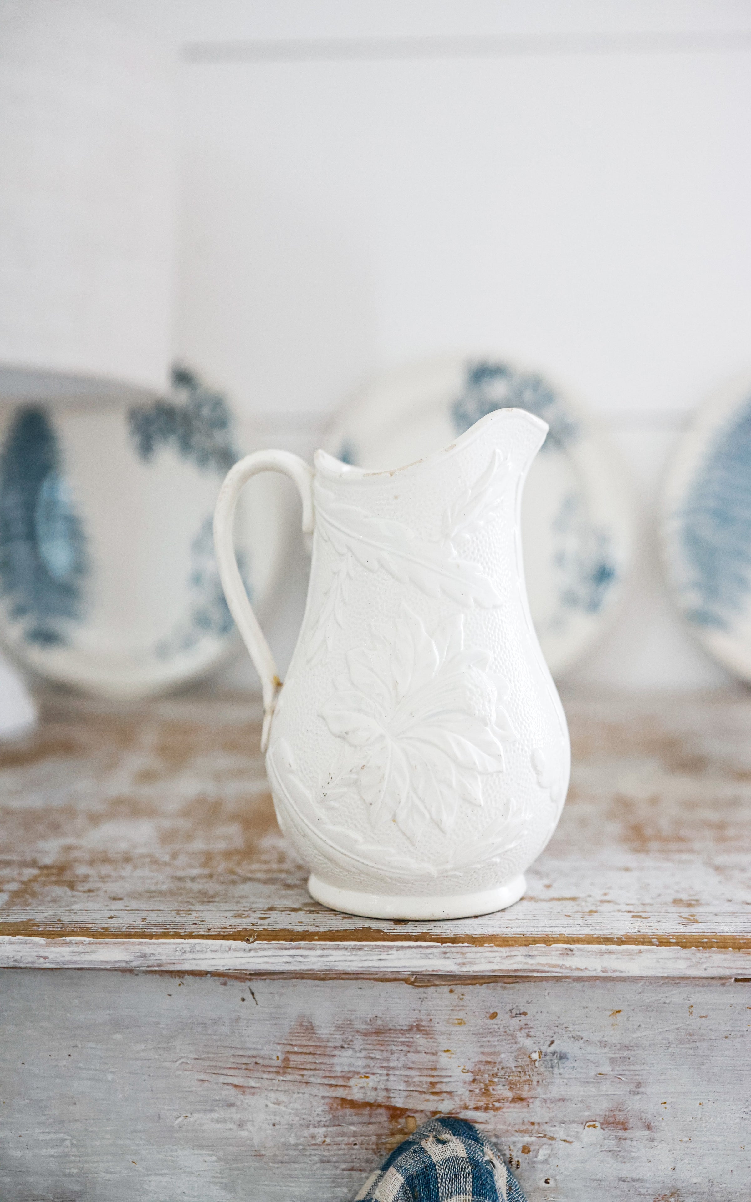 It is vintage and shows signs of wear. The pitcher is worn in areas and contains stains. The handle has been repaired as you can see in the second photo.